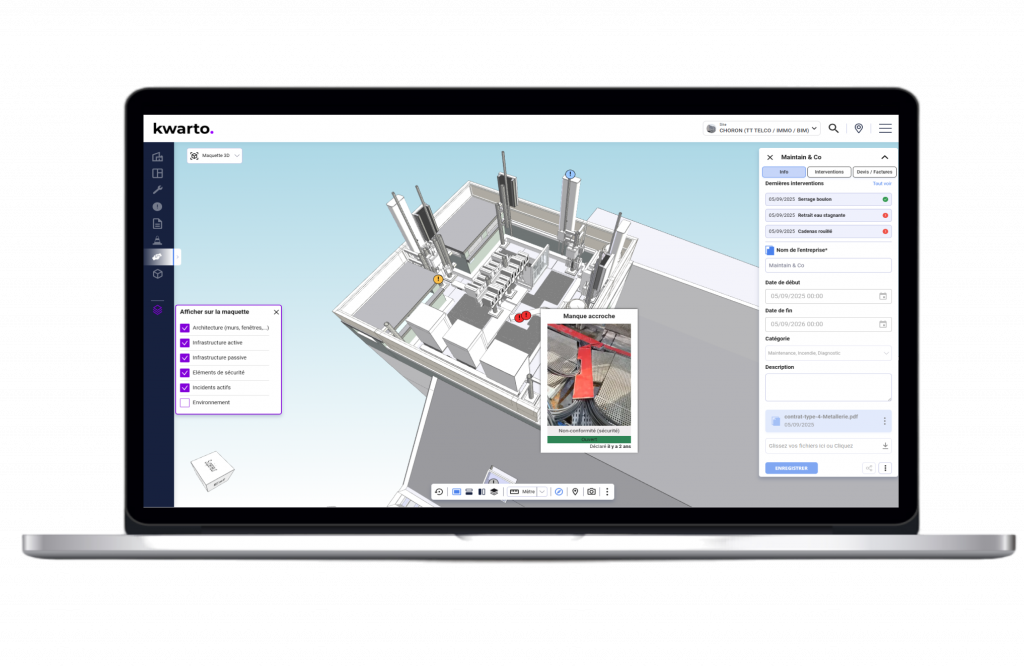En combinant la maquette 3D, l’inventaire et les informations d’accès, Maintain aide à préparer les visites et les interventions en réduisant les repérages préalables. Les équipements concernés et les zones à risque sont identifiés avant de se déplacer.